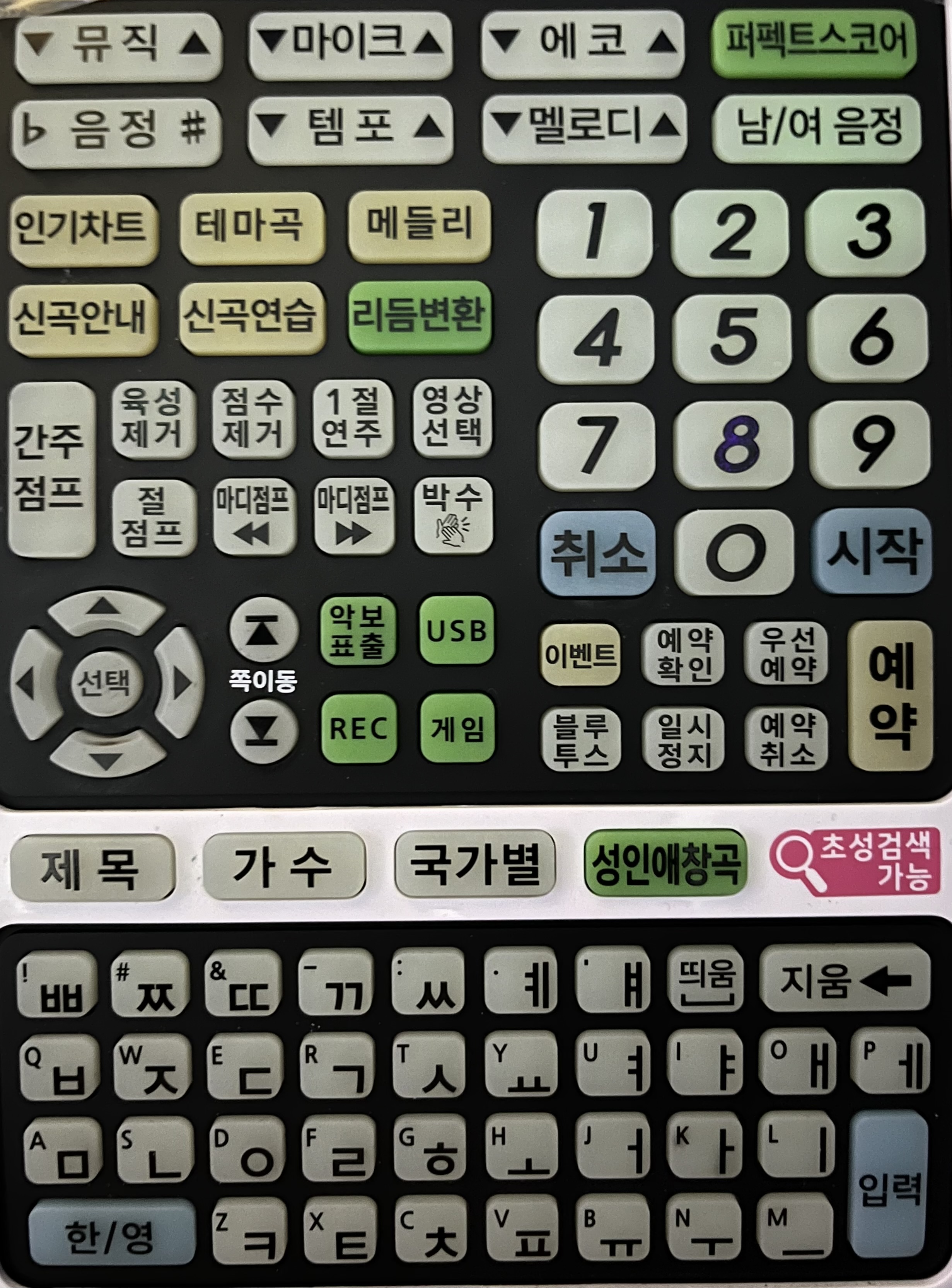 다음은 노래방 리모컨에서 실습을 위한 부분들을 간단히 설명해 보자. 보통 TJ 나 금영 노래방이 있는데, 집 근처에는 TJ 밖에 없어서 그 쪽 기준으로 설명해 본다(둘 다 거의 비슷하다). 앞 시간의 스마트폰 키보드 입력 방법을 배운다고 생각해 보고 봐보자^^