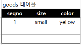엑셀에 그린 테이블의 이름이 아래와 같이 상품(goods) 이고 각 컬럼의 이름에 "일련번호(sequence number-seqno)", "크기(size)", "색상(color)"이 있다고 해보자.